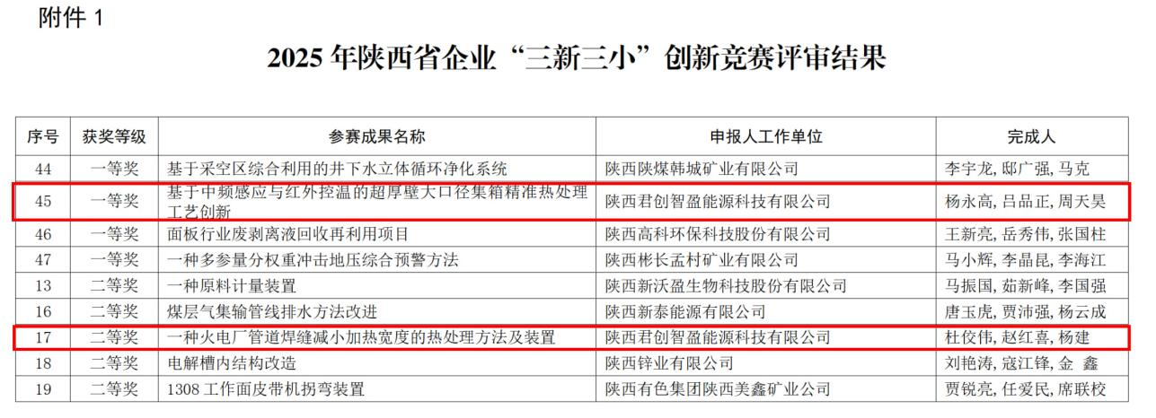 7月20日,電力運營獲悉在2025年陜西省企業“三新三小”創新競賽中,公司下屬子公司君創科技《基于中頻感應與紅外控溫的超厚壁大口徑集箱精準熱處理工藝創新》斬獲一等獎,《一種火電廠管道焊縫減小加熱寬度的熱處理方法及裝置》獲二等獎。